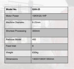 Equipped with a powerful motor, advanced transmission system, and wear-resistant rollers, the GX 6-25 ensures reliable performance under continuous heavy-duty operations. Its cutting system provides precise lengths with minimal wastage, enhancing productivity and cost-effectiveness. The machine also comes with operator-friendly controls that make handling simple and efficient, even for extended working hours.
